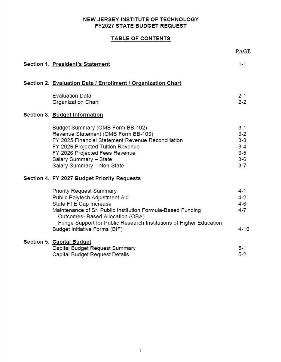 This section identifies budgetary needs exceeding our current appropriation, defined as initiatives to enable New Jersey’s polytechnic university to strategically provide a quality engineering workforce, applied science and technology research, community service, and economic development/industry partnerships, thereby meeting New Jersey’s economic and societal goals.
