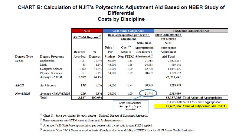 - CALCULATION OF DIFFERENTIAL COST RATIO: STEM VS. NON-STEM: Utilizing the average cost per major, as determined by NBER, the cost of a STEM major relative to a non-STEM major can be determined. For example, using the average cost of delivering a non-stem degree of $34,000 compared to the cost of an engineering degree of $62,297 results in a differential cost ratio of 1.83 for engineering. Using this methodology and applying the resulting cost differential to actual degrees awarded by NJIT in academic year 2023-2024 yields the requested Polytechnic Adjustment Aid of $18,602,086 ($53,187,086 - $34,585,000). (SEE CHARTS B & C below.)