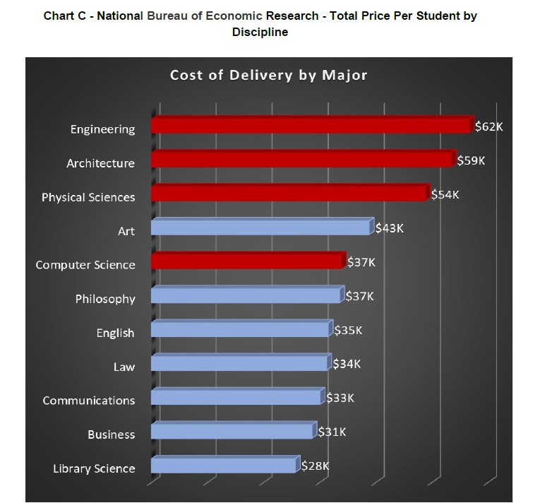 However, while the State’s economy and our STEM graduates reap the benefits of an NJIT degree, State operating aid currently does not account for the differential cost of delivering a STEM education. Specifically, in a working paper entitled “The Costs of and Net Returns to College Major” published by the National Bureau of Economic Research (NBER), economists from Yale University and the University of Chicago found that the delivery of STEM majors such as engineering and the physical sciences cost approximately twice as much as the least expensive majors (business, humanities and library sciences). (See: https://www.nber.org/papers/w23029)