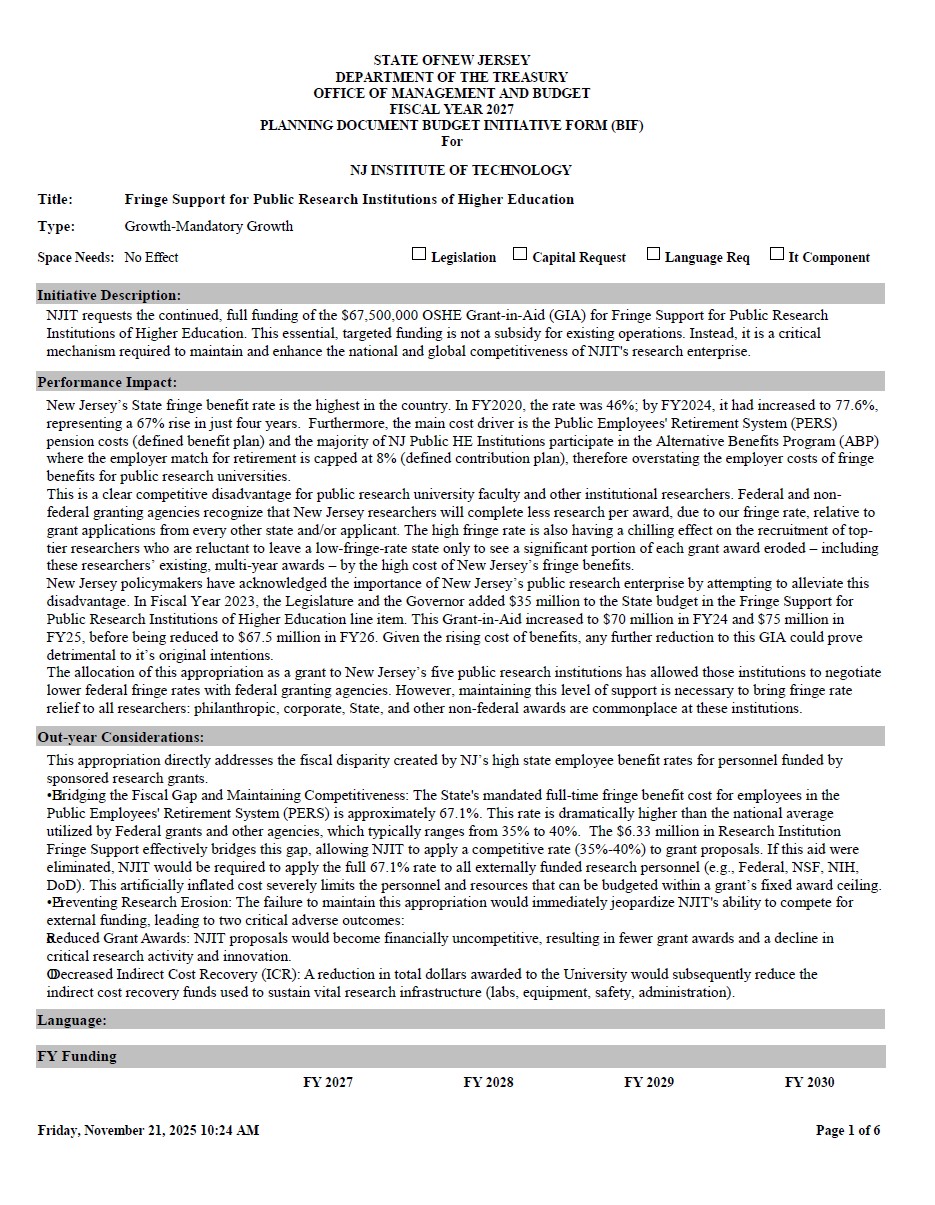 NJIT requests the continued, full funding of the $67,500,000 OSHE Grant-in-Aid (GIA) for Fringe Support for Public Research Institutions of Higher Education. This essential, targeted funding is not a subsidy for existing operations. Instead, it is a critical mechanism required to maintain and enhance the national and global competitiveness of NJIT's research enterprise.