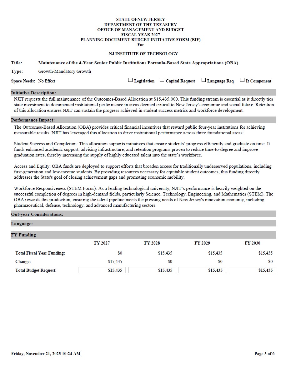 NJIT requests the full maintenance of the Outcomes-Based Allocation at $15,435,000. This funding stream is essential as it directly ties state investment to documented institutional performance in areas deemed critical to New Jersey's economic and social future. Retention of this allocation ensures NJIT can sustain the progress achieved in student success metrics and workforce development.