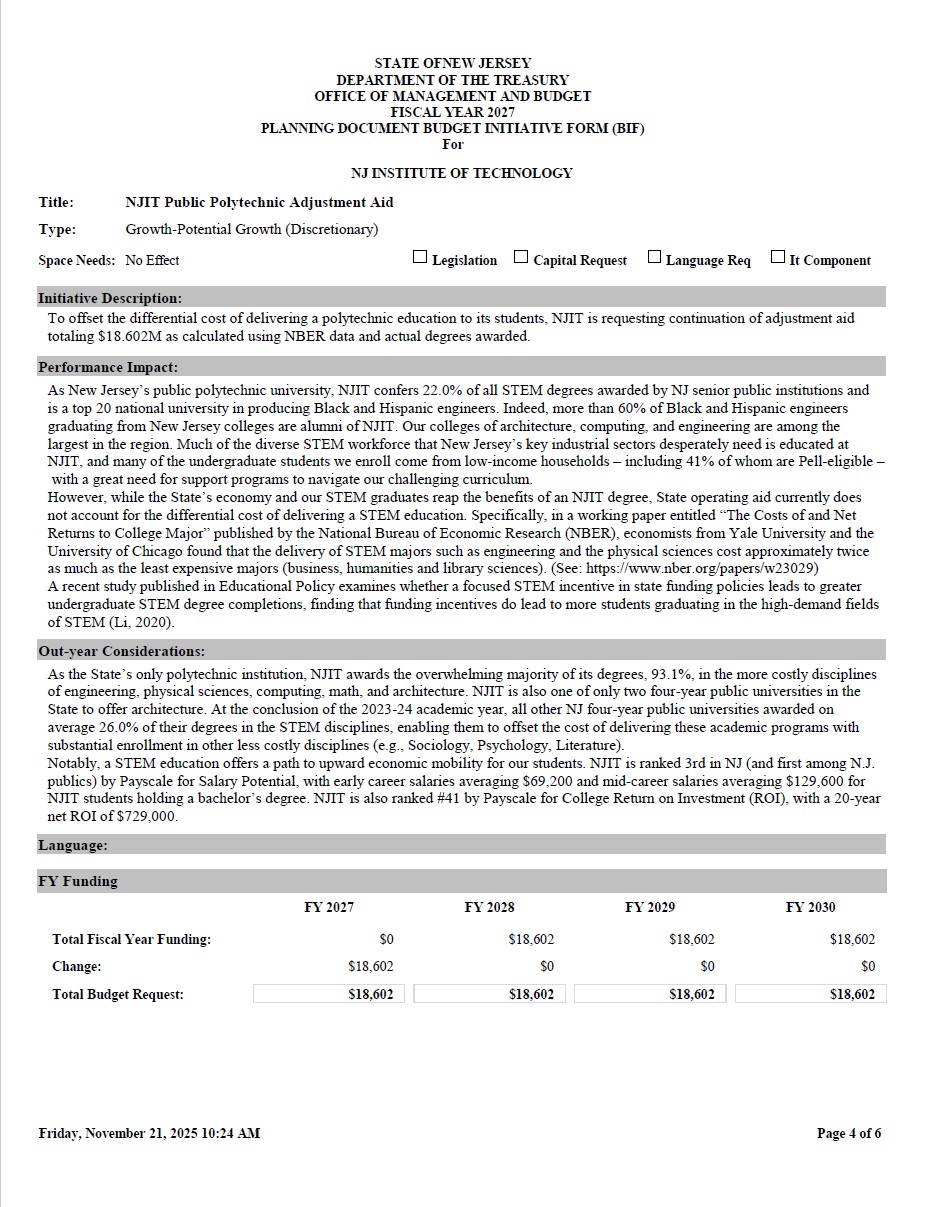 To offset the differential cost of delivering a polytechnic education to its students, NJIT is requesting continuation of adjustment aid totaling $18.602M as calculated using NBER data and actual degrees awarded.