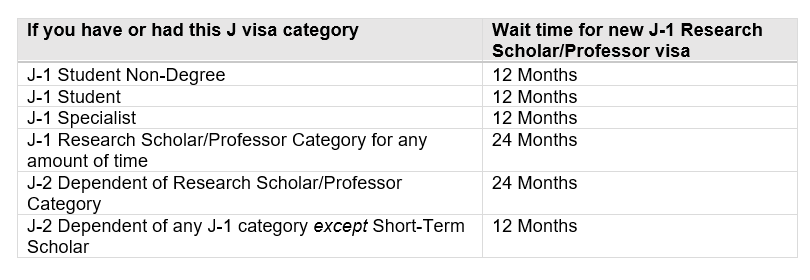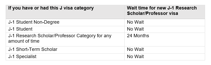 The bars prohibit certain “repeat participation” in the Research Scholar or Professor categories only. The chart below indicates if the category requires that an individual waits 12 months, 24 months, or no time at all before he or she could obtain a new J-1 Research Scholar or Professor visa based on what the previous J status was. It is possible that a J-1 visitor has no wait time related to the 12- and 24-month bars but is subject to the two year home residency requirement.