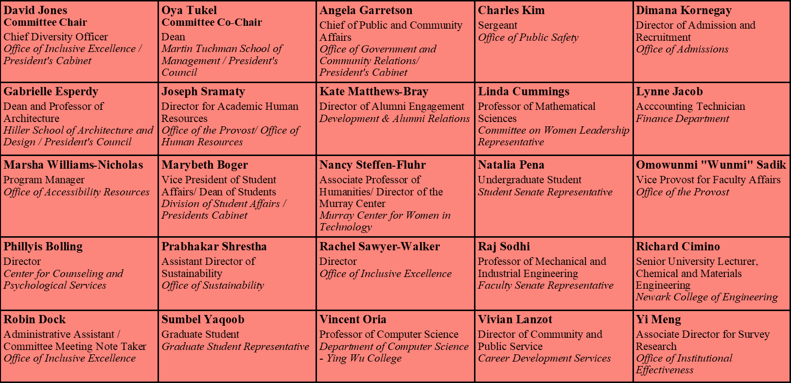 The Committee on Inclusive Excellence is Chaired by Chief Diversity Officer, Dr. David E. Jones and is comprised of 24 members of the university community: students, faculty, and staff. The committee meets monthly. Members of the NJIT community may be invited to meetings throughout the academic year to ensure all voices and thought across the university are included.