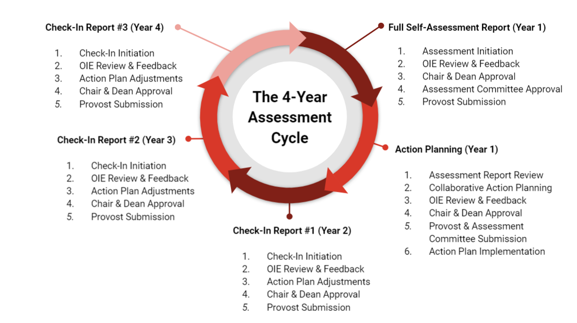 - Provost Submission: Approved assessment reports are submitted to the provost, the program’s chair and dean, and archived to inform the action planning phase of the assessment process as well as resource allocation.