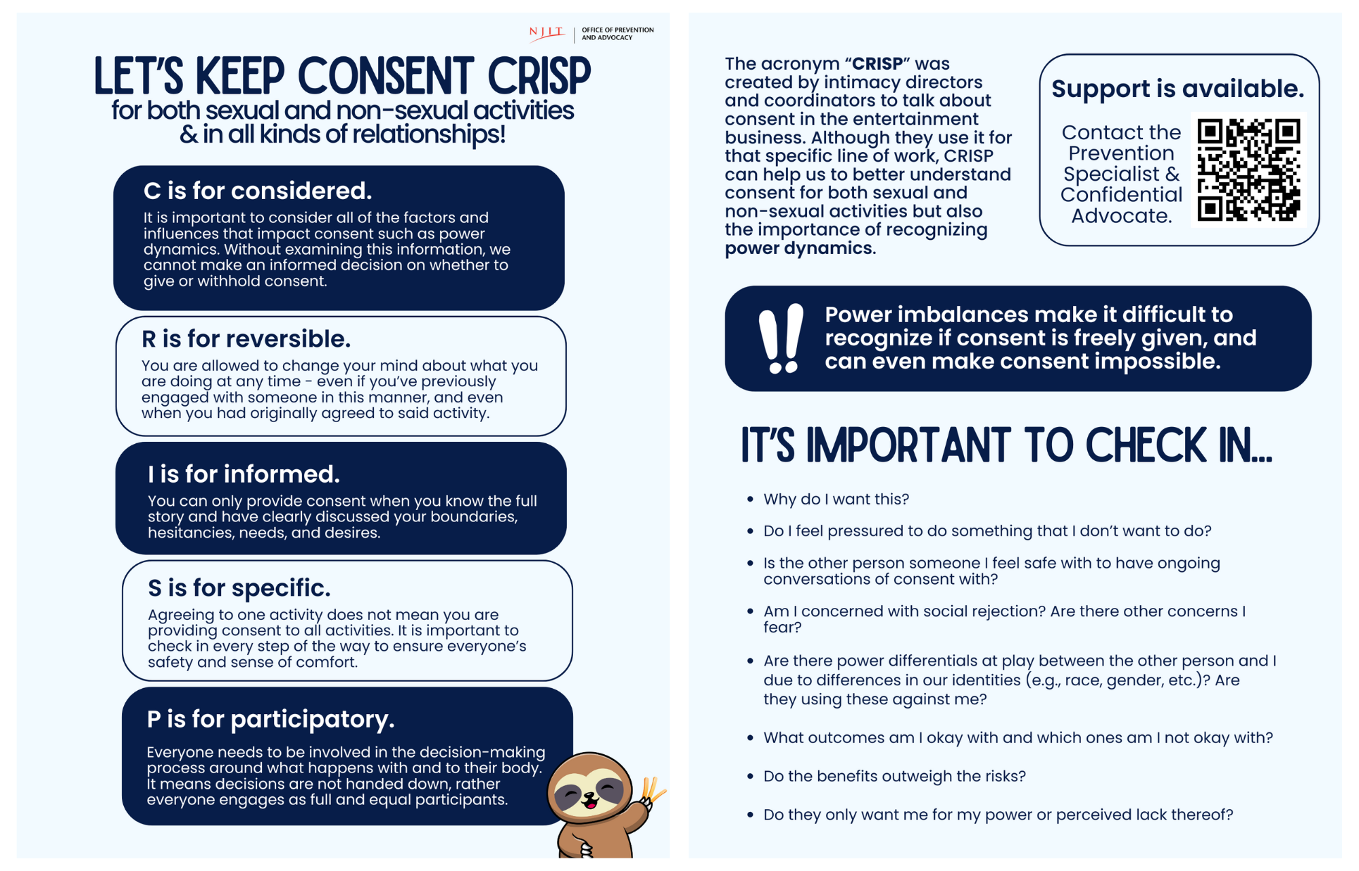 Consent refers to the ability to affirm a situation, activity, or experience (either sexual or non-sexual). Although consent is often framed for sexual activity, it is important to check in with yourself and those around you even if the situation is non-sexual. Consent is essential in all types of relationships.