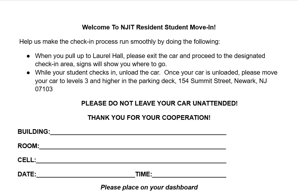 - Laurel Hall residents will proceed to the Summit Parking deck for check-in and unloading directions - Laurel Hall Car Dashboard Card