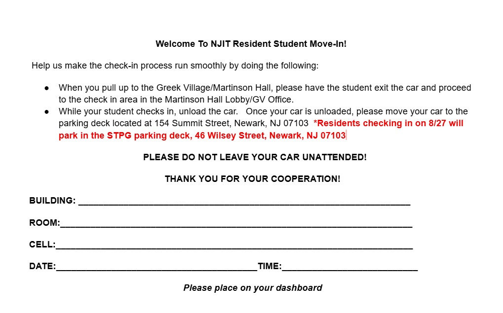 When you arrive you will place all of your items on the walkway, the student will go into their building to check-in while one person will remain with the belongings. Once your belongings are unloaded you will move your vehicle to the Science & Technology Parking Garage (STPG), located at 42 Wilsey Street, Newark, NJ 07103 or Garage Deck Parking, located at 154 Summit Street, Newark, NJ 07102