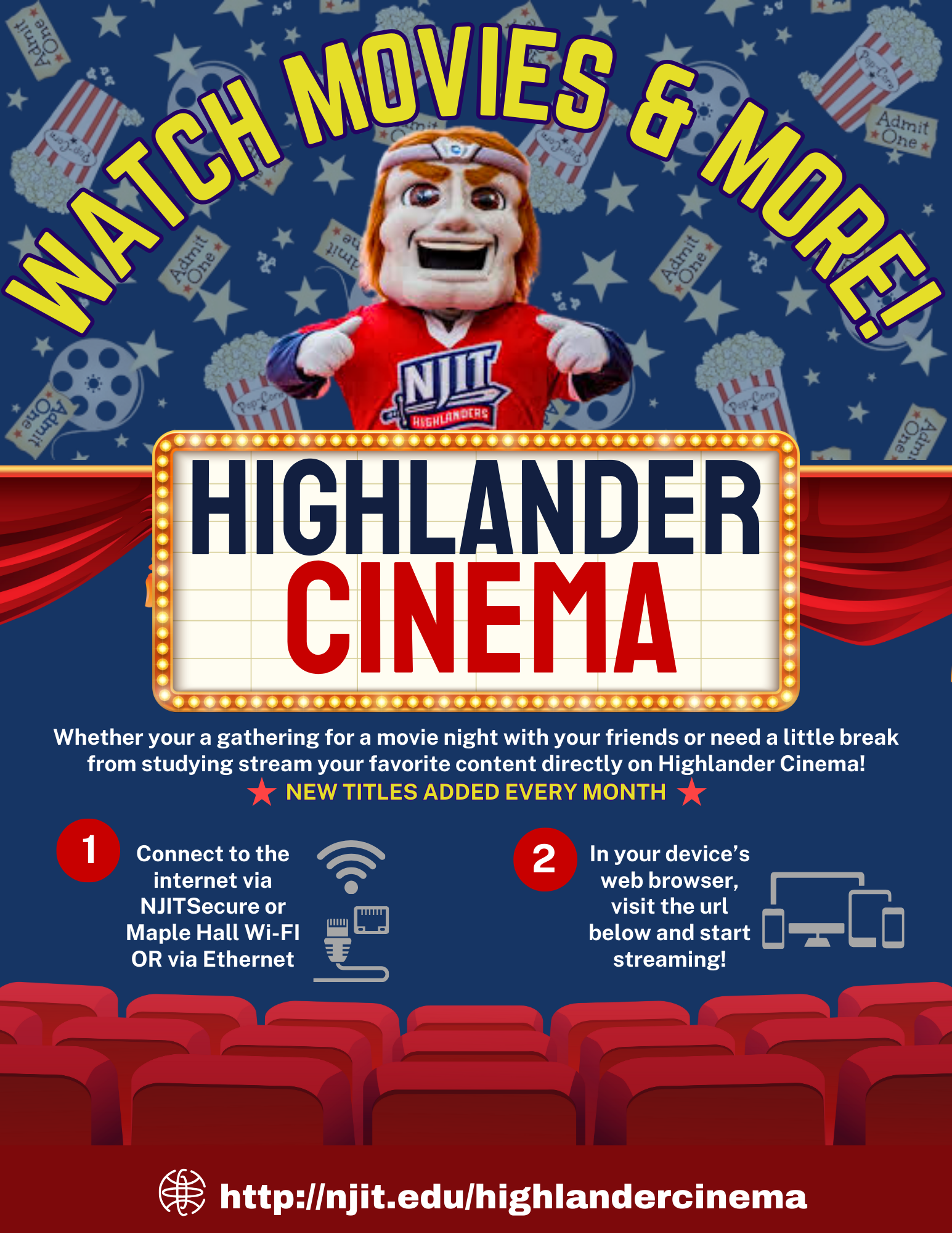 What is Highlander Cinema? An on demand streaming service exclusively available for the NJIT community connected to the on-campus internet via ethernet (hardwired connection), NJITSecured or Smartaira (Maple Hall Wi-Fi).